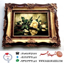 تابلو فرش گل رز زردمشخصات :بافنده: استاد ابری با امضاچله : ابریشمرج شمار : 60ابعاد فرش : 30 در 40 سانتیمتر قاب : چوب توسکا ..