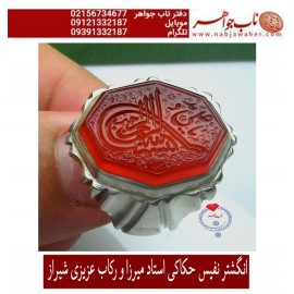 انگشترعقیق سرخ یمنی خطی وحکاکی یا من اسمه دواء و ذکره شفا اثر حکاک بزرگ معاصر استاد محمد مجتبی اتشباز خط میرزا و رکاب فاخر عزیزی شیرازنگین » عقیق سرخ یمنی خطیخط میرزایا من اسمه دواء و ذکره شفا رکاب » رکاب نقره دست سازابعاد سنگ » 21 در 18 میلیمترسایز انگشتر » 64 وزن انگشتر» 21 گرم..