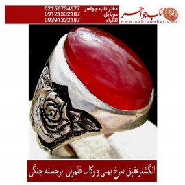 انگشترعقیق سرخ یمنی و رکاب قلمزنی خط برجسته استاد جنگی کد 1833