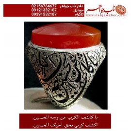 مشخصات انگشتر: انگشترفاخرو نفیس عقیق سرخ یمنی درشت و رکاب قلمزنی استاد جنگی یا کاشف الکرب عن وجه الحسین اکشف کربی بحق اخیک الحسین رکاب : نقره دست ساز استاد رخمانی وزن انگشتر : 41 گرم سایز رکاب : 66 ابعاد سنگ : 25 در 18 میلیمتر انگشترعقیق , یا کاشف الکرب عن وجه الحسین , اکشف کربی بحق اخیک الحسین , انگشتر ..