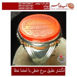 انگشتر عقیق سرخ خطی با امضا عطا ابعاد سنگ : 25 در 22 میلیمترمتن خط : ایات شریفه ایت الکرسی . . . اللّهُ لاَ إِلَهَ إِلاَّ هُوَ الْحَیُّ الْقَیُّومُ لاَ تَأْخُذُهُ سِنَهٌ وَلاَ نَوْمٌ لَّهُ مَا فِی السَّمَاوَاتِ وَمَا فِی الأَرْضِ مَن ذَا الَّذِی یَشْفَعُ عِنْدَهُ إِلاَّ بِإِذْنِهِ یَعْلَمُ مَا بَیْنَ أَیْدِیهِمْ وَمَا خَلْفَهُمْ وَلاَ ی..