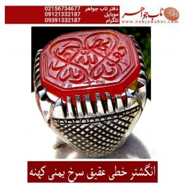 انگشترعقیق سرخ یمنی و رکاب قلمزنی خط برجسته استاد محسن جنگی کد 1843