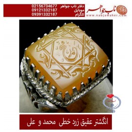انگشتر عقیق زرد خطی محمد و علی عقیق زرد درشت با خط استاد قنبری با امضامتن : محمد ( ص ) در وسط و 8 علی (ع ) دور تا دوروزن 15 گرمسایز 70..