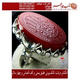 مشخصات انگشتر :انگشتر درشت کلکسیونی عقیق یمنی و کف العباس و چهار سلام نگین : عقیق سرخ یمنی متن خط : کف العباس علیه السلامشامل : السلام علی الحسین و علی علی بن الحسین و علی اولاد الحسین و علی اصحاب الحسینو نام نامی یا ابا الفضل العباس علیه السلامقطر نگین : 28 در 18 میلیمتر رکاب : نقره دست ساز زیبا و شکیل کافی خراسانسایز انگشتر ..
