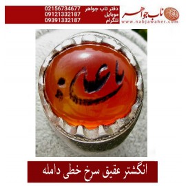 انگشتر عقیق سرخ دامله اب دارخطی نگین : عقیق سرخ رکاب : نقره دست ساز جامی تهران متن: یا علی سایز : 62..
