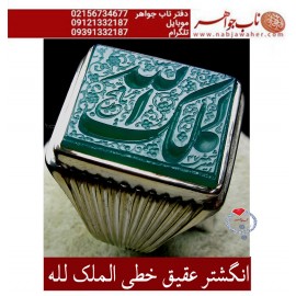 مشخصات انگشتر :انگشتر عقیق سبز خطی چهار ضلعی متن حکاکی الملک لله حکاک : استاد شمس زنجانی ( شمس الفقیر )رکاب : نقره دست ساز استاد سید حسین وزن انگشتر : 20 گرمسایز رکاب :64 ابعاد سنگ : 16 در 20 میلیمتر..
