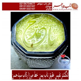 مشخصات انگشتر: انگشترنفیس عقیق ناب یمنی حکاکی یا محمد ص خط میرزا استادمجتبی آتشباز ورکاب سیدحسن..