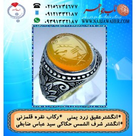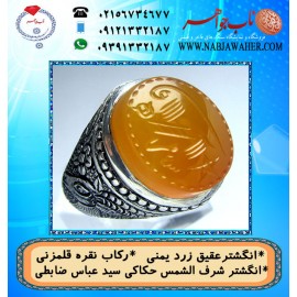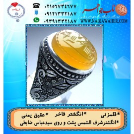 انگشترنفیس عقیق زرد یمنی دو طرف نگین حکاکی سید عباس ضابطی خط س ع