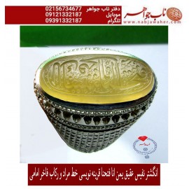 مشخصات انگشتر:انگشترنفیس عقیق زرد زعفرانی یمنی خاص وحکاکی آیه انا فتحنا لک فتحا مبینا خط ثلث قرینه نویسی استاد مراد جعفری و رکاب فاخر امامیمتن حکاکی » انا فتحنا لک فتحا مبینا حکاک» استاد مراد جعفریخط مرادرکاب فاخر شبکه استاد وحیدامامیطهران امامینگین » عقیق زرد یمنی تراش بادومی به ابعاد 27 در 11 میلیمترامضا » مرادوزن انگشتر» 26 گرم ..