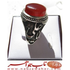 انگشترنقره مردانه عقیق سرخ یمنی همراه با شناسنامه بین المللی و رکاب فاخر احمدنامی قلمزنی جنگی