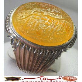 انگشترنفیس عقیق زرد یمنی یا فاطمه الزهرا اشفعی لنا فی الجنه حکاکی محسن ضرغامی خط م ض ورکاب محمدافتخاری