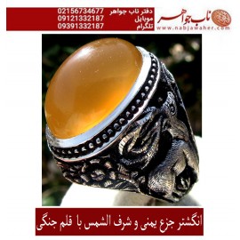 مشخصات انگشتر:انگشترنقره مردانه عقیق زرد یمنی همراه با شناسنامه بین المللی و رکاب فاخر مهدی رحمانی قلمزنی جنگی..