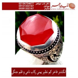 مشخصات انگشتر: انگشتر فاخرعقیق ناب سرخ پاک یمنی وتراش فست جواهری رکاب احمد نامی و قلمزنی استاد جنگی نگین » عقیق ناب کم نظیرسرخ پاک یمنی تراش جواهری به قطر 17 میلیمتر رکاب » نقره دست ساز استاد احمد نامی قلم » استاد جنگی مشهد با مهر و امضا متن قلم » علی حجه الله و فاطمه حبیبه الله وزن انگشتر » 25 گرم سایز رکاب » 67 ..