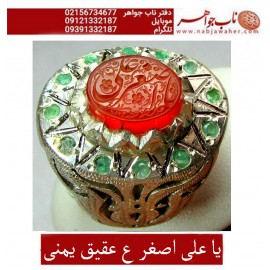 مشخصات انگشتر: انگشترخطی عقیق سرخ یمنی حکاکی یا علی اصغر توسط استاد مبین حکاکی متن نگین باب الحوایج: یا علی اصغر ع حکاکی استاد حسین رضیعی با مهر و امضا مبین رکاب : نقره دست سازشاهرخ با دوازده قطعه زمرد وزن انگشتر : 17 گرم سایز رکاب :64 ابعاد سنگ : 12 در 10 میلیمتر انگشترفاخر , عقیق سرخ یمنی ..