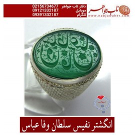 انگشترعقیق سبز ابدار حکاکی السلام علیک یا صاحب الزمان یا بقیه الله یا ولی الله یا مهدی خط الفقیر شمس استاد مهدی شمس ورکاب نقره فیلی دستساز حمید 110