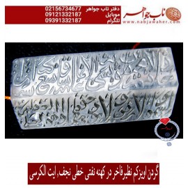 مشخصات گردن آویز کم نظیر خطی : گردن آویزنفیس در نجف درشت و کهنه لول شش ضلعی حکاکی ایت الکرسی کامل بسم الله الرحمن الرحیم اللّهُ لاَ إِلَهَ إِلاَّ هُوَ الْحَیُّ الْقَیُّومُ لاَ تَأْخُذُهُ سِنَهٌ وَ لاَ نَوْمٌ لَّهُ مَا فِی السَّمَاوَاتِ وَمَا فِی الأَرْضِ مَن ذَا الَّذِی یَشْفَعُ عِنْدَهُ إِلاَّ بِإِذْنِهِ یَعْلَمُ مَا بَیْنَ أَیْد..