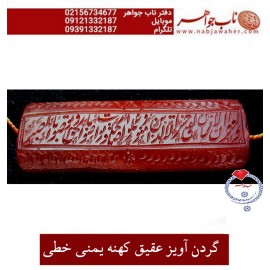 گردن آویزنفیس عقیق نباتی یمنی درشت و کهنه لول شش ضلعی حکاکی سوره های توحید و فلق
