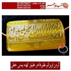 گردن آویزنفیس عقیق زرد یمنی درشت و کهنه لول شش ضلعی حکاکی صلوات و ذکر