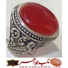 انگشترنقره مردانه عقیق سرخ یمنی همراه با شناسنامه بین المللی و رکاب فاخر احمدنامی قلمزنی جنگی