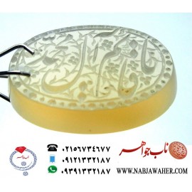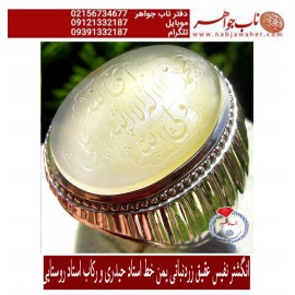 مشخصات انگشتر :انگشترفاخر و نفیس عقیق زردنباتی یمنی حکاکی ذکر ماشاالله صغیرخط العبدنگین این انگشتر عقیق زرد نباتی زجاجی یمنی است که استاد کریم پرنیا با توقیع العبد ذکر ماشاالله لاقوه الا بالله استغفرالله را با ترکیب عالی و استفاده از تمامی فضای سنگ و به رسم الخط ثلث حکاکی کرده است. رکاب فیلی این انگشتر دستساز و مهر لبیک دارد به رکاب لبیک معروف ..
