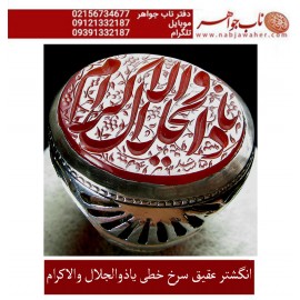انگشتر عقیق خطی سرخ با ذکر یا ذوالجلال و الاکرام حکاکی : ساجدمتن خط : یا ذوالجلال و الاکرام رکاب : نقرهبه وزن  17 گرم و سایز 58 ..