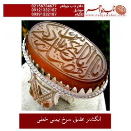 انگشترعقیق سرخ یمنی ابعاد سنگ : 17 در 14 میلیمترمتن خط : یا علی (قرینه)حکاک : سید مهدی یوسفی خط میررکاب : نقره دستساز سایز رکاب  : 50 وزن انگشتر : 12 گرم ۰۹۱۲۱۳۳۲۱۸۷..