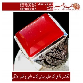 مشخصات انگشتر: انگشتر فاخر قواره درشت تراش زاویه عقیق ناب یمنی و رکاب احمد نامی و قلمزنی استاد جنگی نگین » عقیق ناب کمنظیرسرخ پاک یمنی به ابعاد 21 در 17 میلیمتر رکاب » نقره دست ساز استاد احمد نامی با مهر و امضا قلم » استاد جنگی مشهد با مهر و امضا متن قلم » محمد نبی الله علی ولی الله وزن انگشتر » 46 گرم سایز رکاب » 67 ..