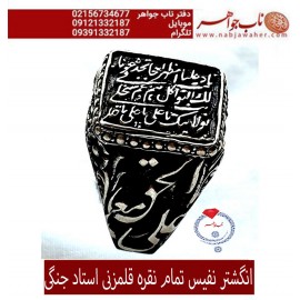 مشخصات انگشتر :انگشتر قلمزنی خاص تمام نقره استاد جنگی متن قلمزنی در دو طرف رکاب :روايت پيامبراکرم«صلی الله علیه و آله و سلم»که فرمودند: عَلِيٌّ مَعَ الْحَقِّ وَ الْحَقُّ مَعَ عَلِيٍّ و در نگین ذکر نادعلی:نادِ عَلیاً مَظهَرَالعَجائِب تَجِدهُ عَوَناً لَکَ فِی النَوّائِب کُلَّ هَمٍ وَغَمًّ سَیَنجَلی بِوَلایَتِکَ یا عَلِیُّ  یا عَلِیُّ ..