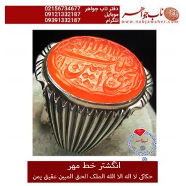مشخصات انگشتر: انگشترنفیس خطی نقره مردانه عقیق_یمنی خط_مهر،حکاکی محسن_سعیدی_منش رکاب_شیرازی ، وحکاکی_نصرمن_الله_وفتح_قریب