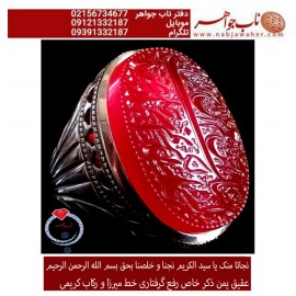 انگشترنفیس مردانه عقیق سرخ یمنی خط میرزا حکاکی استاد مجتبی اتشباز ذکر یا سیدالکریم نجنا و خلصنا بحق بسم الله الرحمن الرحیم رکاب تهران کریمی