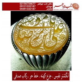 مشخصات انگشتر:انگشترنفیس عقیق سرخ کهنه یمنی حکاکی یا علی ابن موسی الرضاع خط حرّ حکاکی استاد رضا قربانی رکاب نقره فطرس حکاکی روی نگین » یا ابن موسی الرضاعحکاکی » رضا قربانیخط حرّ رکاب نقره فطرس نگین » عقیق سرخ کهنه یمنی به ابعاد 15 در 11میلیمترسایز رکاب » 62 وزن » 10 گرم..